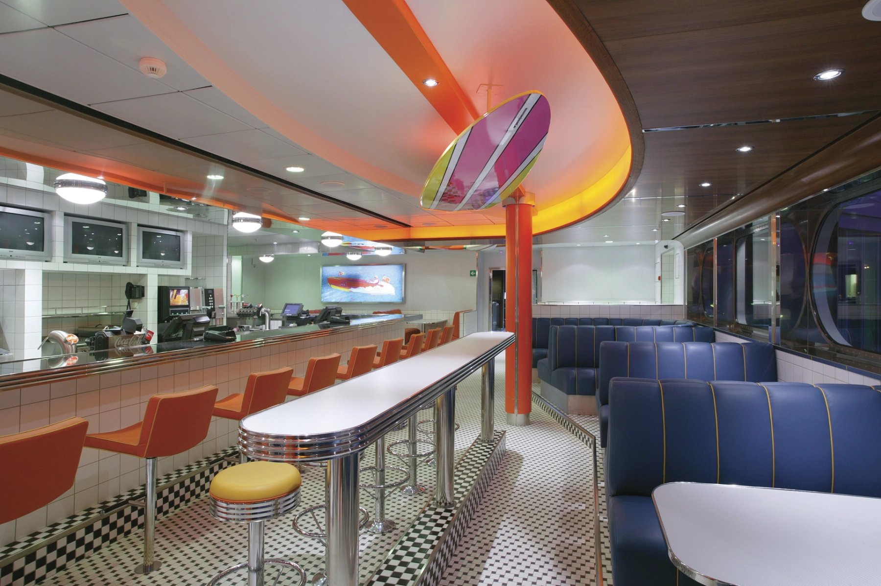 Willkommen in einem klassischen American Diner, in dem Sie sich entspannen und ein leckeres Burger-Menü in einer lockeren Atmosphäre genießen können. Das Interieur ist inspiriert von Surfkultur, den Beach Boys und Brylcreem – mit einem charmanten Retro-Flair, das sofort für gute Stimmung sorgt.
